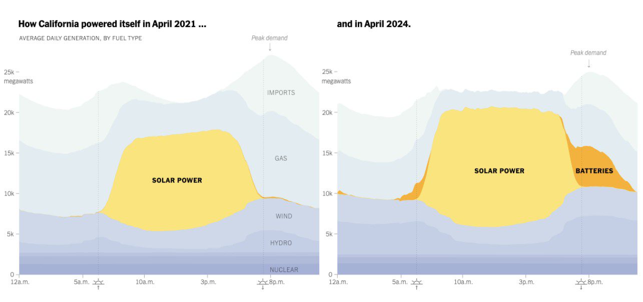 Per capire la rivoluzione in corso, guardate questi due grafici in alto. Tre anni fa la California prendeva prevalentemente energia dal sole di giorno, e dai combustibili fossili di notte (figura a sinistra).